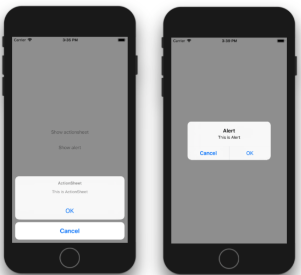 아이폰에서는 아래와 같은 모습을 한다 (왼쪽 : ActionSheet, 오른쪽 : Alert)
