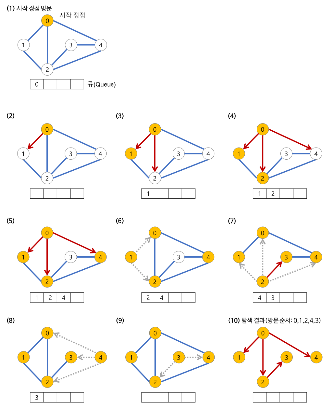 - 즉, 선입선출(FIFO) 원칙으로 탐색