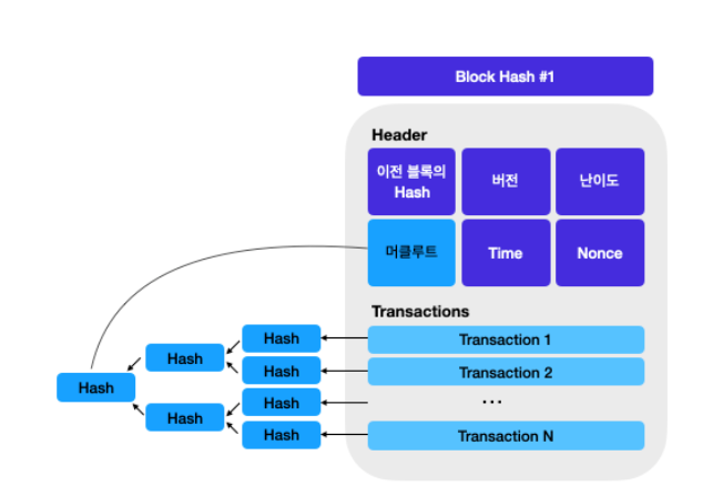 - 머클트리는 여러 데이터데 대해 단계적으로 해시 함수를 적용하여 하나의 해시값으로 나타내는 데이터 구조