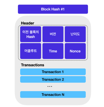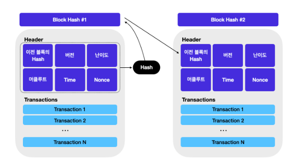 블록체인 특징상 위 그림의 #1 블록 해시값은 #2 블록 헤더에 포함이 되는구조다