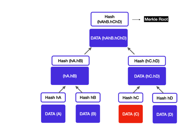 머클 트리는 위의 그림과 같이 여러개의 데이터(A,B,C,D)를 여러 단계를 거쳐서 하나의 해시값으로 만드는 트리