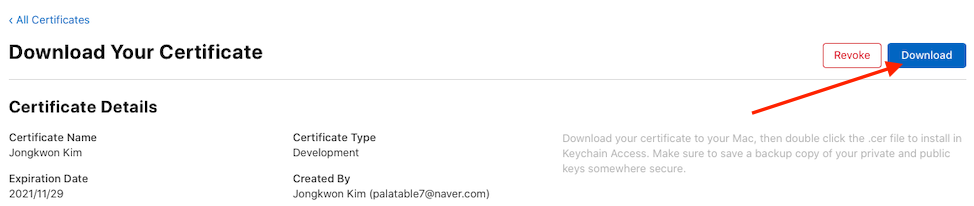 - 이 private key가 존재해야, xcode에서 실행할 수 있는데 개발자끼리 협업을 할 때 이 private key를 공유해서 써야 원활한 개발이 가능 (private key를 잊으면 갱신하면 되는데, 이 때 다른 개발자가 기존의 private key는 무효화 되어 동기화에 문제)