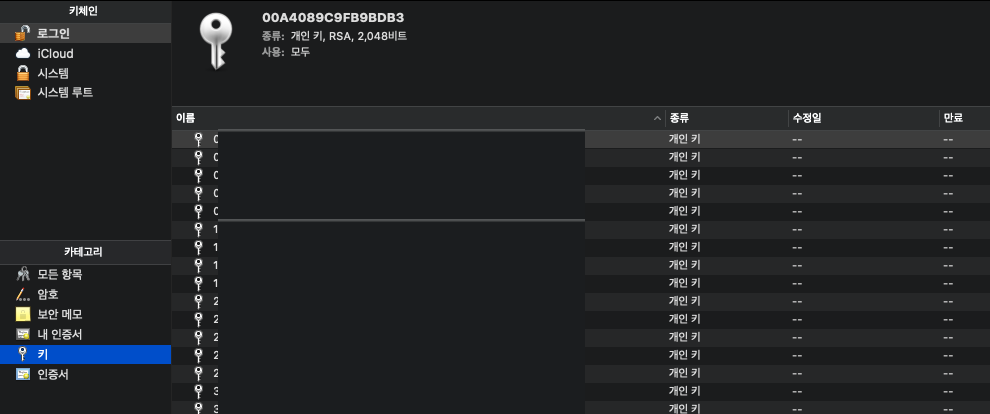 - private key를 추출하려면, 인증서에 해당하는 key에 오른쪽 마우스 -> 내보내기로 ~.p12파일 획득 가능