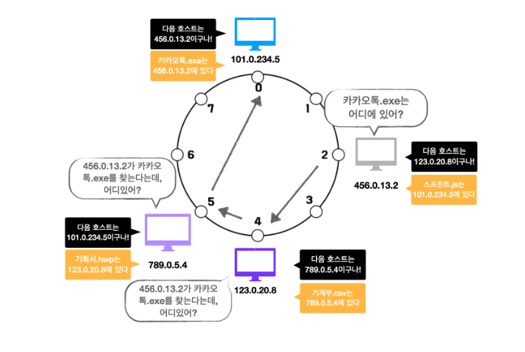 '기획서.HWP'의 해시 값은 5이므로, 해시 테이블의 인덱스5에 있는 호스트인 789.0.5.4는 기획서가 123.0.20.8에 있는것을 기억하게 되는 겁니다!