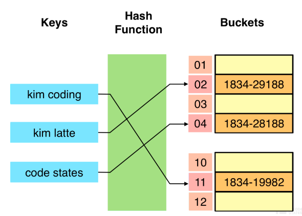 - Key : 다양한 길이의 값이 들어올 수 있음, 해시 함수를 통해 변환하지 않은 상태로 저장소에 저장이 되면 다양한 길이만큼의 저장소를 구성해 두어야함