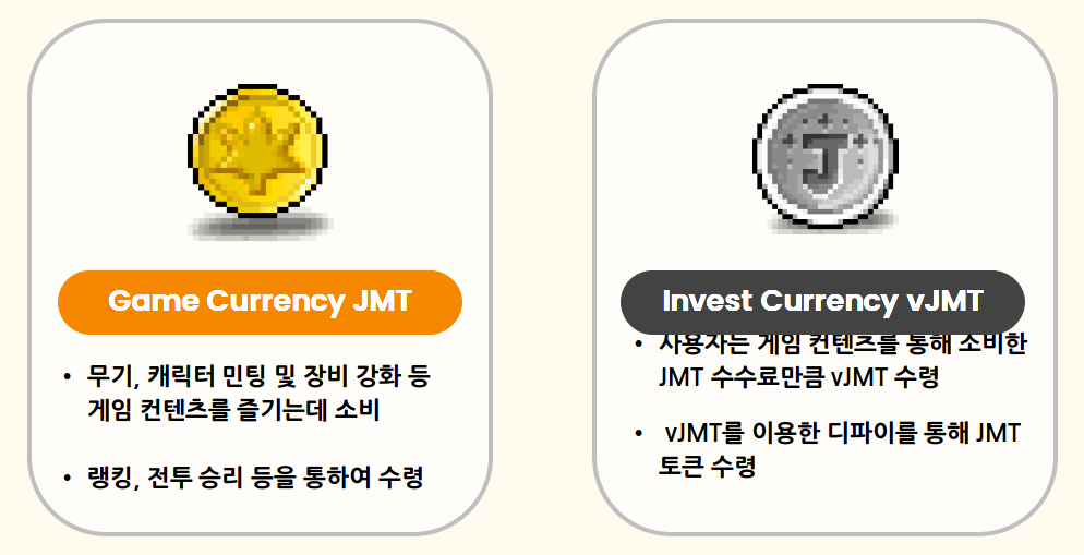 우리 프로젝트에는 JMT, vJMT 토큰이 두가지가 존재하는데 각각 발행되는량이 다르고 초기 공급량이 다르다 그리고 게임 컨텐츠를 통해 추가 발행되는 토큰도 있고 한번에 발행되고 점차 Burn되어 전체 유통량을 줄이기도한다