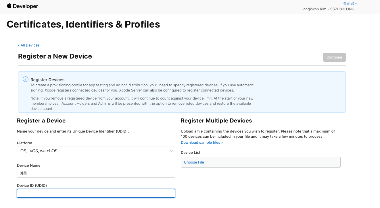 - 애플 개발자 홈페이지 -> Devices 메뉴에서 +버튼 클릭