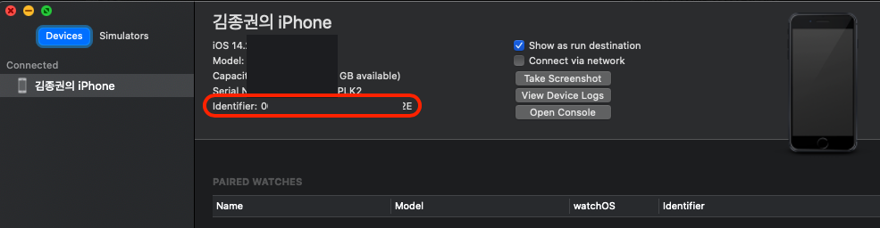 - 테스트 할 device를 맥북에 연결 -> Xcode -> Window -> Devices and Simulators 선택