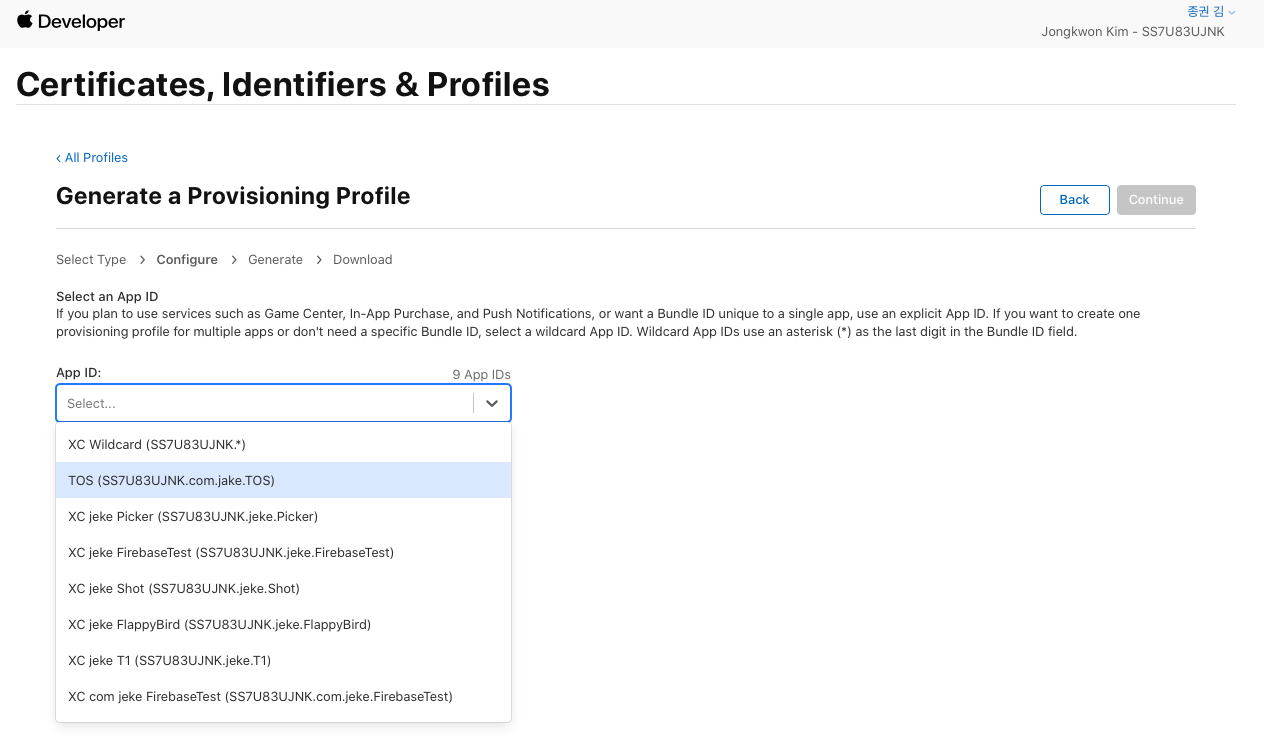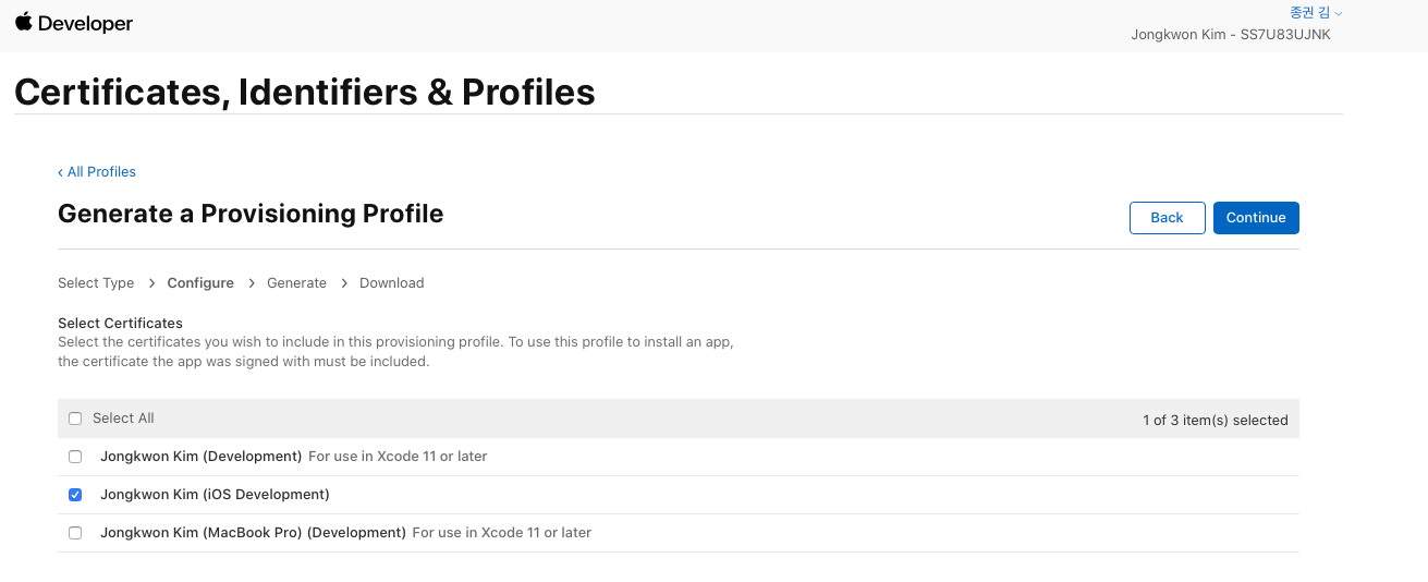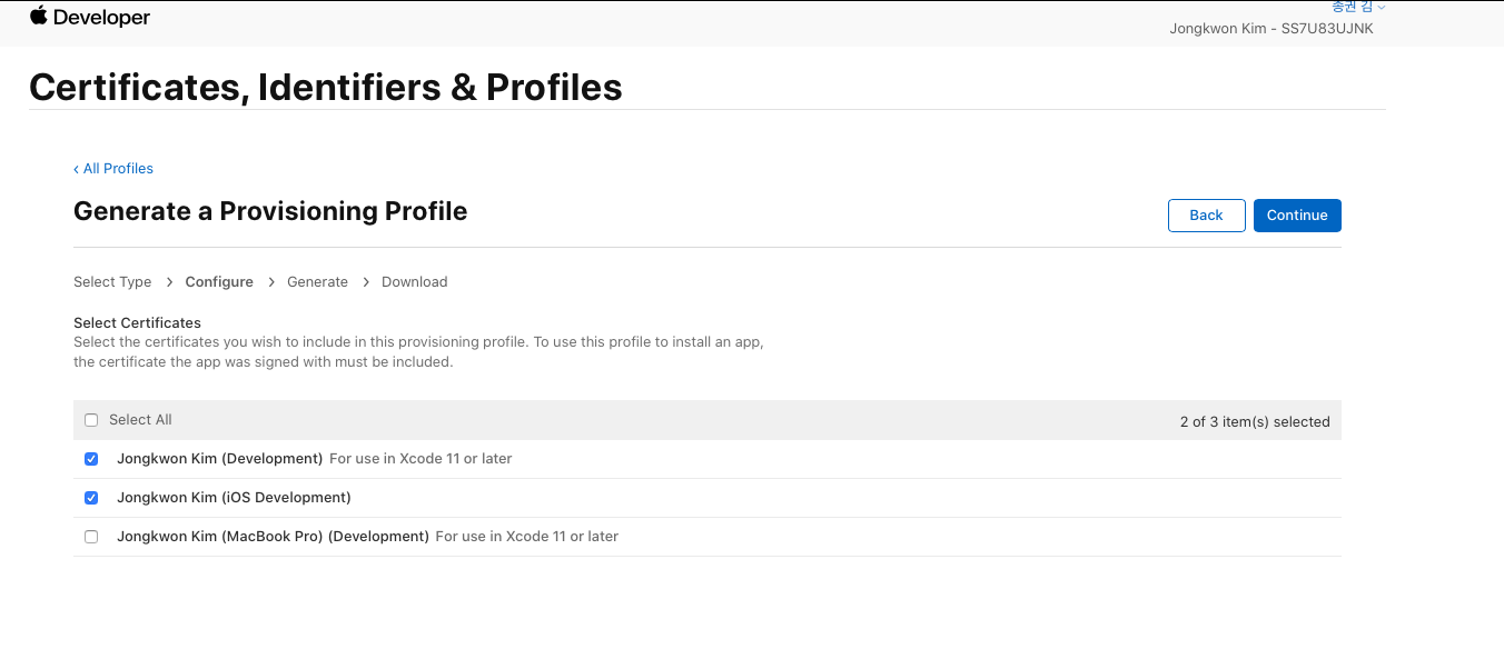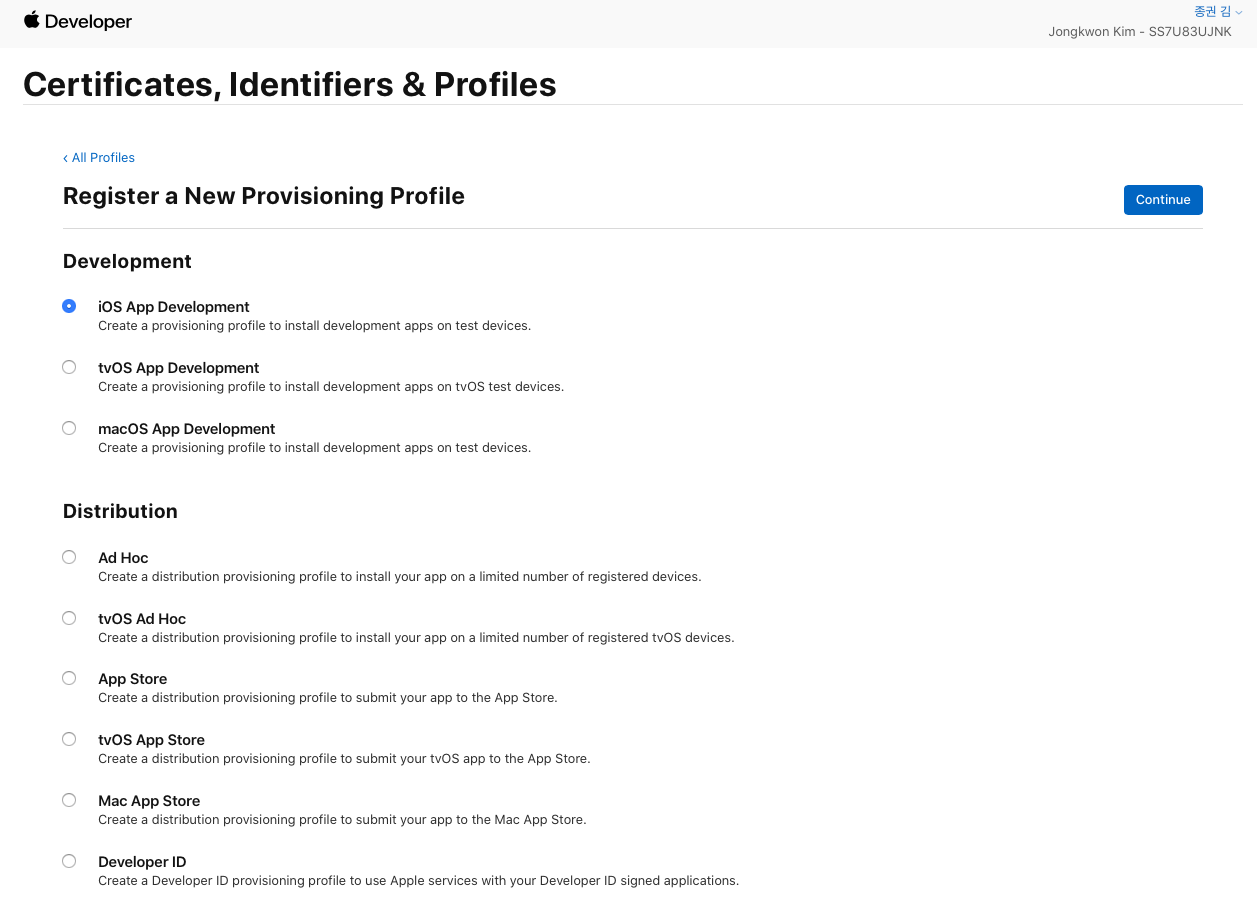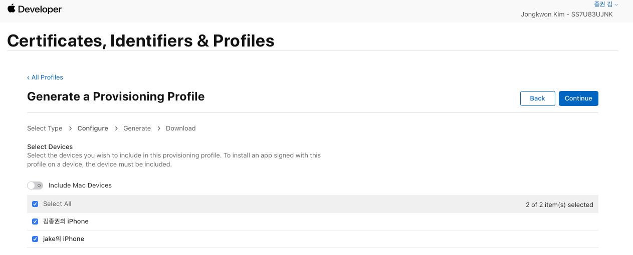 - iOS App Destribution (xcode에서 debug용)과 Ad Hoc (내부 테스터에게 배포용) 각각 체크하여 생성