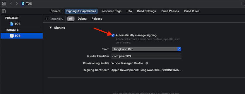- Automatically manage signing 해제