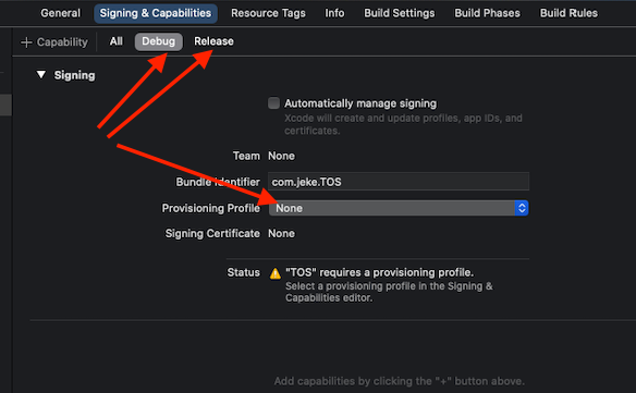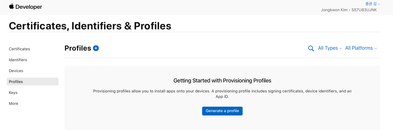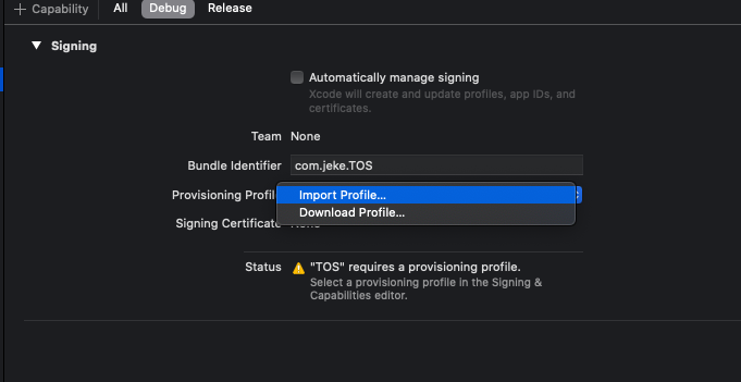 - Debug, Release 각각 import Profile하여 위에서 받은 Provisioning Profile 등록 (debug - Development, Release - Ad hoc)